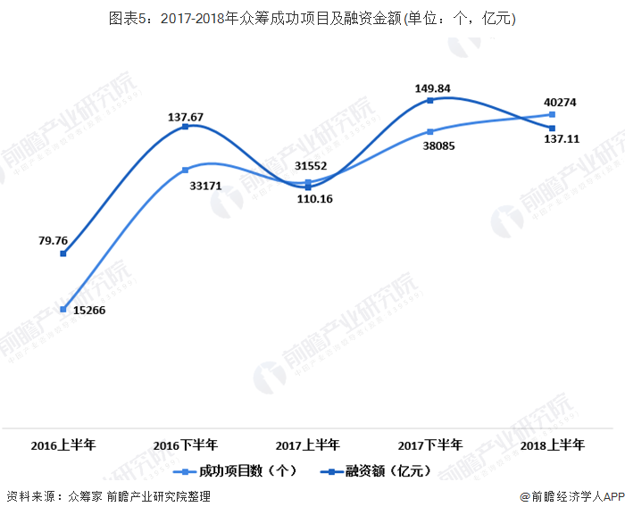 虽然近年来众筹平台的数量骤减,但众筹成功项目及融资额都成上升趋势。2018年上半年,共获取项目48935个,成功项目数为40274个,成功项目融资额达到137.11亿元,与2017年同期成功项目融资总额110.16亿元相比增长了24.46%,成功项目支持人次约为1618.06万人次。