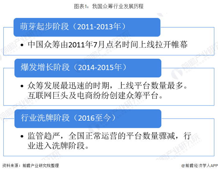而我国众筹行业的发展经历了三个阶段:萌芽起步阶段、爆发增长阶段和行业洗牌阶段。