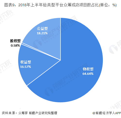虽然股权型众筹平台发展势头迅猛,但其众筹项目融资金额和成功数量都排在给类型平台的下游。2018年上半年,物权型众筹平台成功项目27976个,占比64.64%,成功项目融资金额达69.13亿元,占比50.42%;权益型众筹平台成功项目7169个,占比16.57,成功项目融资金额53.14亿元,占比38.75%;而股权型众筹平台成功项目875个,占比仅为0.58%,成功金额约12.99亿元,占比仅为9.47%。