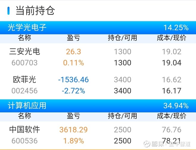 我今天的持仓有三安光电,欧菲光,中国软件。