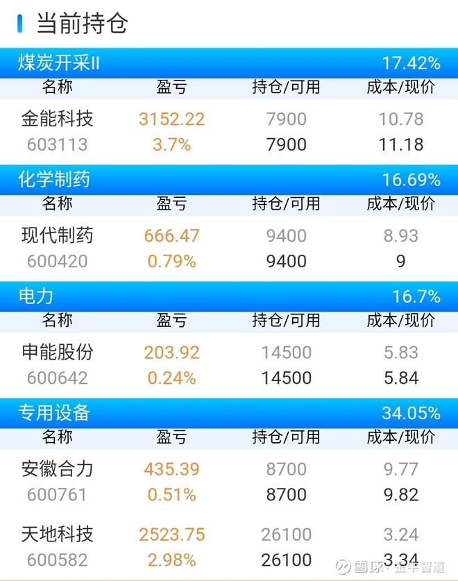 我今天的持仓有金能科技,现代制药,申能股份,安徽合力,天地科技。