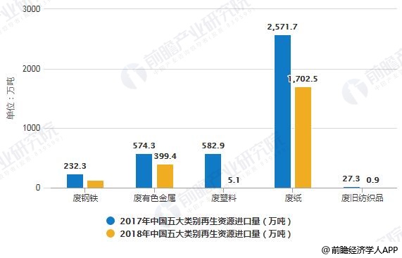 2018年,我国废钢铁、废有色金属、废塑料、废纸、废旧纺织品五大类别的再生资源进口总量1986.6万吨,同比下降45.1%。受到相关进口政策调整的影响,五大类别的再生资源进口量均出现下滑,其中降幅最大的是废塑料,同比下降99.1%。