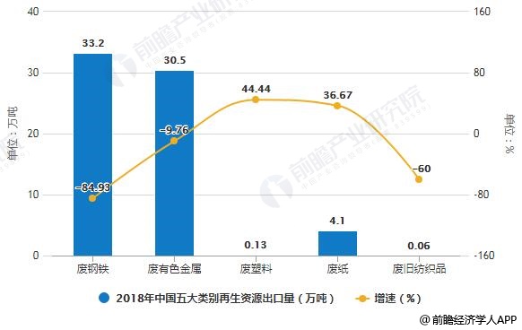 2018年中国五大类别再生资源出口量统计及增长情况