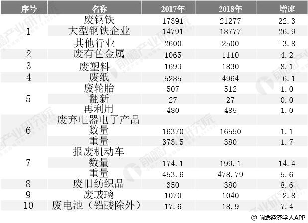 再生资源是指在生产和生活消费中产生的,不再具有原来使用价值,但经过回收、分类和加工处理,能获得新的使用价值的各种废物。2018年,随着污染防治攻坚战持续推进,环保督查力度进步加大,钢铁、有色金属等行业减少原生矿产资源的使用量,不断提高废钢铁、废有色金属等环保原料的使用比例,我国再生资源回收总量增长较快。