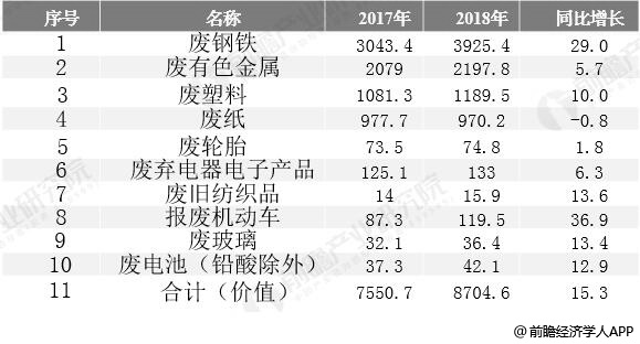 2017-2018年中国再生资源主要类别回收价值统计及增长情况