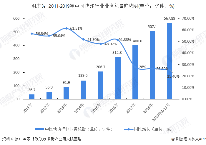 2019年1-11月,全国快递服务企业业务量累计完成567.9亿件,同比增长25.4%,预计全年业务量将达到610亿件左右;业务收入累计完成6725.7亿元,同比增长23.9%。其中,同城业务量累计完成99.3亿件,同比下降3%;异地业务量累计完成455.7亿件,同比增长33.8%;国际/港澳台业务量累计完成12.9亿件,同比增长28.3%。