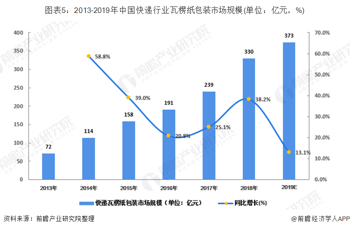 根据中国造纸协会旗下的《中华纸业》杂志数据显示,近些年中国的快递瓦楞纸包装市场规模在不断上升,2018年达到了330亿元。预计2019年能够达到373亿元。