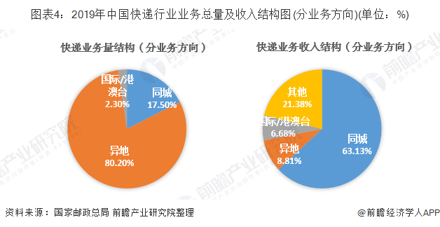 在结构方面,2019年1-11月,同城、异地、国际/港澳台快递业务量分别占全部快递业务量的17.5%、80.2%和2.3%;业务收入分别占全部快递收入的10.1%、52.8%和9.9%。与去年同期相比,同城快递业务量的比重下降5.1个百分点,异地快递业务量的比重上升5个百分点,国际/港澳台业务量的比重上升0.1个百分点。