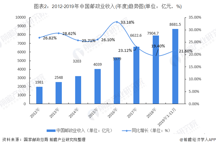 2019年1-11月,邮政行业业务收入(不包括邮政储蓄银行直接营业收入)累计完成8681.5亿元,同比增长21.6%;业务总量累计完成14517.3亿元,同比增长31.2%。其中,邮政服务业务总量累计完成2259.8亿元,同比增长25.4%;邮政寄递服务业务量累计完成224.6亿件,同比增长3.5%;邮政寄递服务业务收入累计完成390.6亿元,同比增长15.3%。
