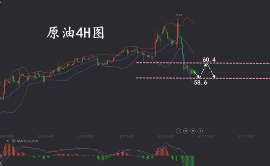 原油当前的下跌触及58.6位置算是暂时告一段落,接下来不是盘整就是反弹的走势,所以今日重点关注60.4位置的压力,此位置下,原油将会是继续盘整震荡的走势,区间在58.6-60.4区域内,如果突破,则原油反弹继续测试上方62位置的压力。60.4位置是当前多空分水岭位置,早盘此位置下还可以空。