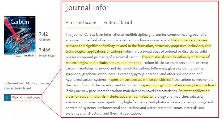 据说,这是一条非常常见的稿件未送审就直接被拒稿理由,尤其是容易出现在投稿新手中。事实上,每一家期刊都会在期刊首页安排一个入口,“View aims and scope”(如下图所示),介绍自己期刊概况以及文章的接收范围。所以说,在选刊阶段,最好先仔细阅读目标期刊的稿件收录范围;也可以用自己文章的关键词在期刊中检索一下,了解一下与自己稿件相关的话题在该杂志中的发表情况后再投稿。