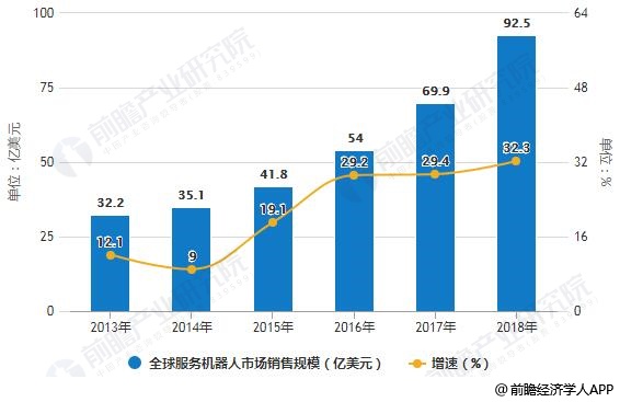 2013-2018年全球服务机器人市场销售规模统计及增长情况