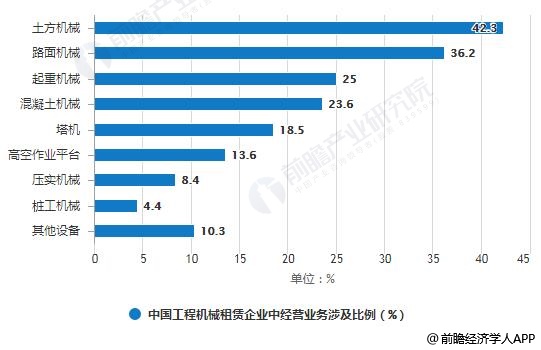 根据中国工程机械工业协会工程机械租赁分会的调查数据显示,2018年我国工程机械租赁企业中经营业务涉及最多的是土方机械;其次为路面机械;起重机械位居第三,工程机械租赁为土方机械、路面机械、起重设备、混凝土设备等提供了广阔的市场。2019年上半年我国工程机械行业发展良好,但是行业结构未发生重大变化。