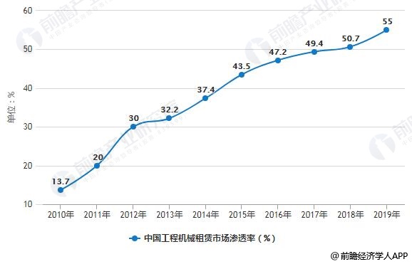 2010-2019年中国工程机械租赁市场渗透率统计情况及预测