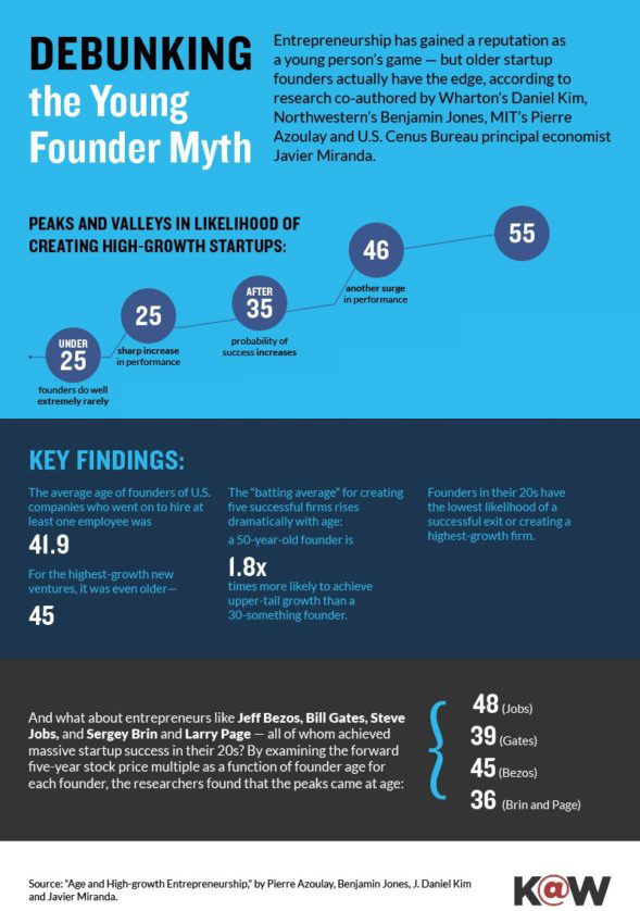 扎克伯格和比尔·盖茨在十几岁的时候就创立了他们的开创性公司。乔布斯在21岁时设立了苹果公司。他们的故事受到广泛关注,许多人相信年轻的企业家是最成功的。