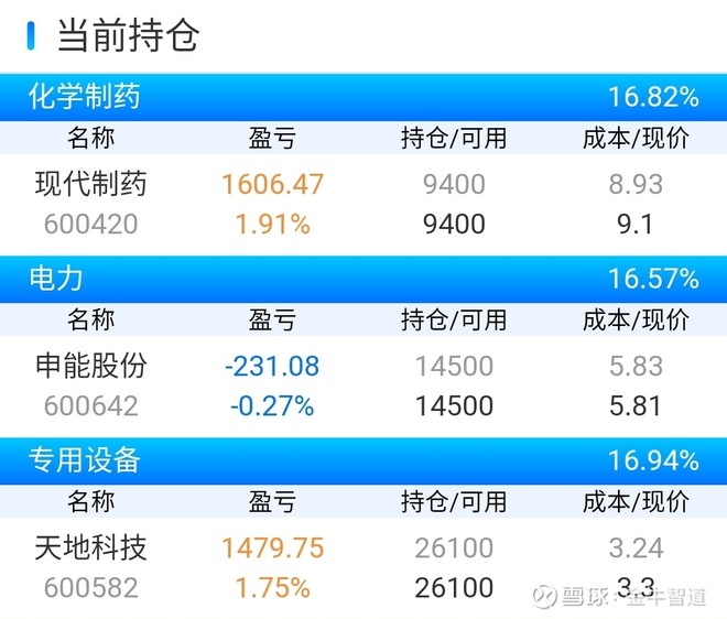 我今天的持仓有现代制药,申能股份,天地科技。