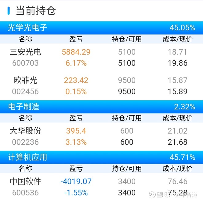 我今天的持仓有三安光电,欧菲光,大华股份,中国软件。
