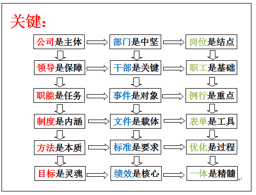其中,“为何做”说的是管理的使命,而“做怎样”指的是管理的目标。管理体系则是为达成特定目标而为特定组织及其成员做特定的事所设计的特定的方法的有机整体。但建立管理体系的概念很辛苦,。对此,我们要有足够的思想准备,更要有持之以恒的忍辱心。要让具体管理措施有效落实,就得做到作业任务可操作,组织成员具体,保障条件可行,监督激励到位。