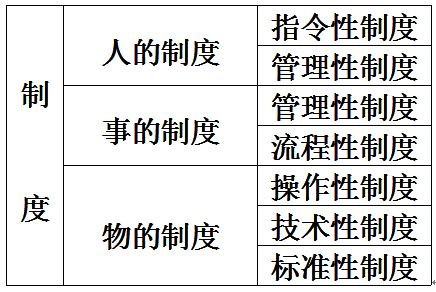 如上图所示,在企业中,对于企业运营系统的“人、物、事”各要素都要有制度。