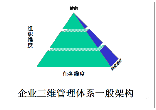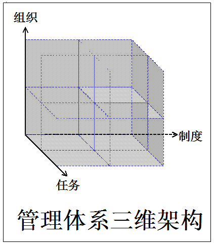 管理体系可分为三维架构,分别是组织(主体)、任务(工作)与制度(方法),也就是说:围绕使命,什么组织用什么方法做什么样的事情。