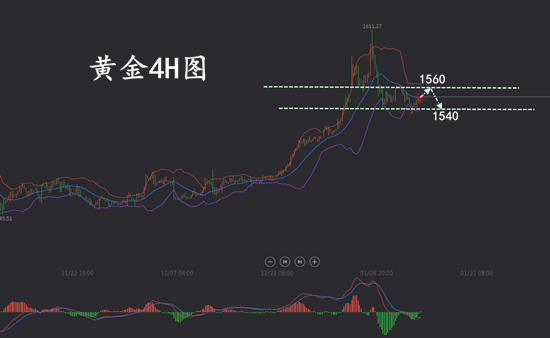 现在行情报价处于1550附近徘徊,没有回踩就没有进场的机会,震荡行情不追单,继续耐心等待回踩做多的机会,若是多单始终都不给机会,那就等上轨压力做空即可。