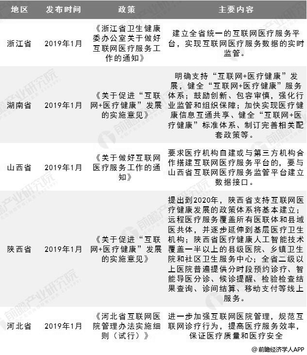 在国家各政府部门推进下,全国各省市陆续出台针对本地区互联网医疗发展的利好政策。截至2019年11月,已有甘肃、吉林、内蒙古等15个省份陆续出台了《关于促进“互联网+医疗健康”发展的实施意见》,山东、广东、宁夏等省已出台推进互联网医疗的行动计划。