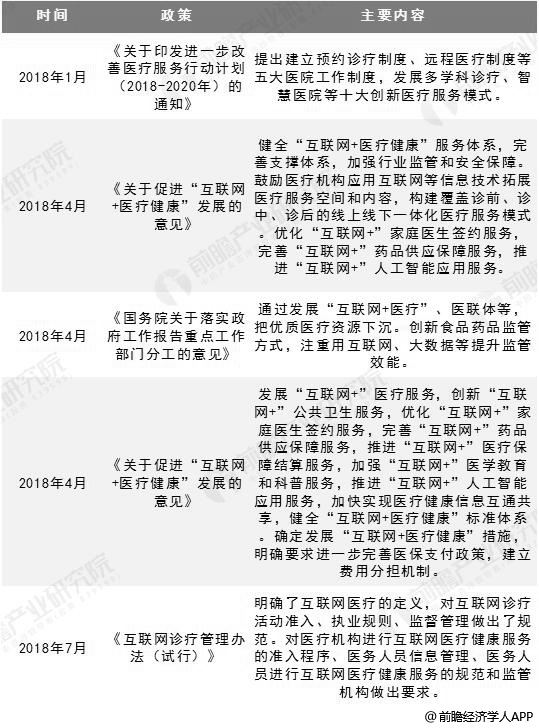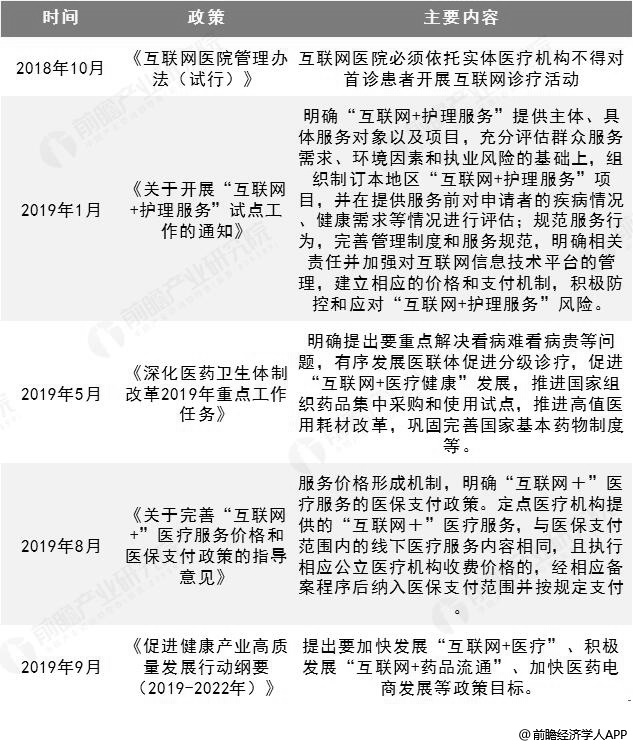 2018年以来,我国互联网医疗领域政策密集出台,如《关于促进“互联网+医疗健康”发展的意见》、《互联网诊疗管理办法(试行)》、《关于规范家庭医生签约服务管理的指导意见》等,明确国家对发展“互联网+医疗健康”的态度。