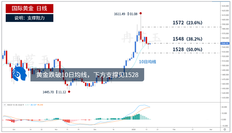 黄金日线走势,昨日价格收阴于1548水平,该水平为10日均线和斐波那契38.2%回调位组成的共振支撑。今日价格延续跌势,跌破1548水平,同时RSI指标自超买水平回落也确认了回调走势,进一步支撑见斐波那契50%回调位1528。若价格上行,阻力见斐波那契23.6%回调位1572。观点:日线看跌,支撑见1528。(突破1572则观点失效)