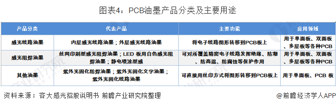 PCB油墨产品以感光油墨为主,主要应用于PCB领域,按用途不同又可分为PCB感光线路油墨、PCB感光阻焊油墨和其他油墨等。