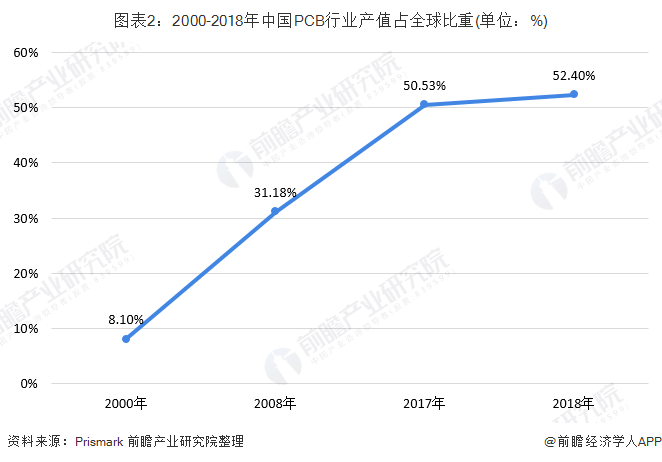 中国作为全球PCB行业的最大生产国,占全球PCB行业总产值的比例已由2008年的31.18%上升至2017年的52.40%。