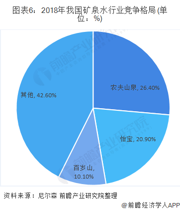 目前,市场上的矿泉水品牌较多,包括国内外各大知名品牌,如法国依云、法国巴黎水、百岁山、怡宝、农夫山泉等。根据尼尔森数据,2018年中国矿泉水市场中农夫山泉占有率排名第一,占有率达26.40%;怡宝第二,占有率为20.90%;百岁山位居第三,占有率为10.10%。行业前三市场占有率共达到57.40%,行业集中度较高;且市场占有率前三的品牌均属于国产品牌。
