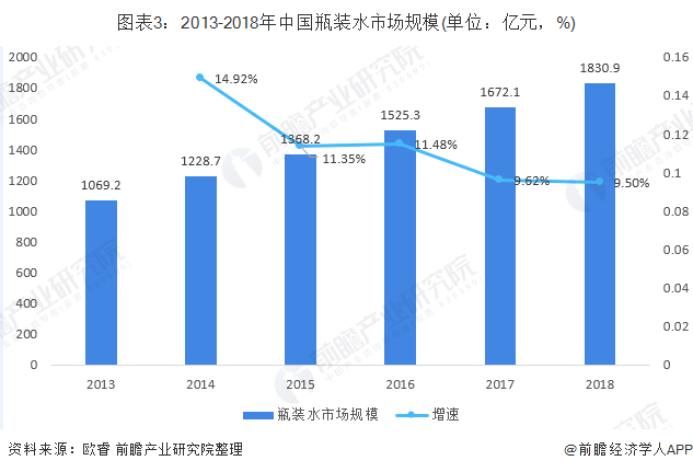 随着居民人均收入提高带来的消费升级以及接连不断的水污染事故影响,居民对于瓶装水的需求也日益增长。根据欧睿咨询统计数据,2013-2018年我国瓶装水销售规模逐年增长,由2013年1069.2亿增长至2018年的1830.9亿元,年均复合增长率高达11.8%。