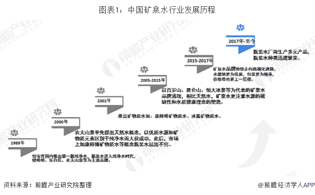 矿泉水是从地下深处自然涌出的或经人工揭露的、未受污染的地下矿水;含有一定量的矿物盐、微量元素或二氧化碳气体;在通常情况下,其化学成分、流量、水温等动态在天然波动范围内的相对稳定。此外,矿泉水为国民饮水消费升级的产物,经历了纯净水-天然水-矿泉水的发展历程,随着我国经济的不断发展未来前景可观。