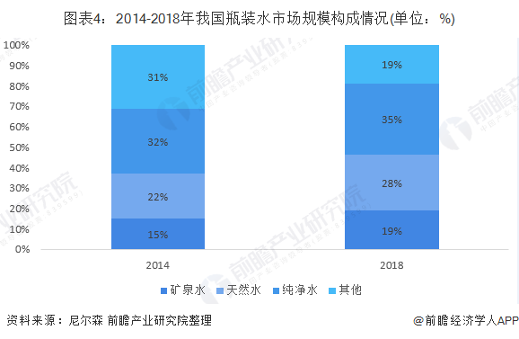 从瓶装水的市场结构来看,矿泉水占瓶装水总体营收比重稳步提升,从2014年的15%提升至2018年的19%,可见随着消费升级,国民饮水需求亦处于升级阶段,矿泉水凭借自身健康属性强和产品差异化策略正在获取更多的市场认可。