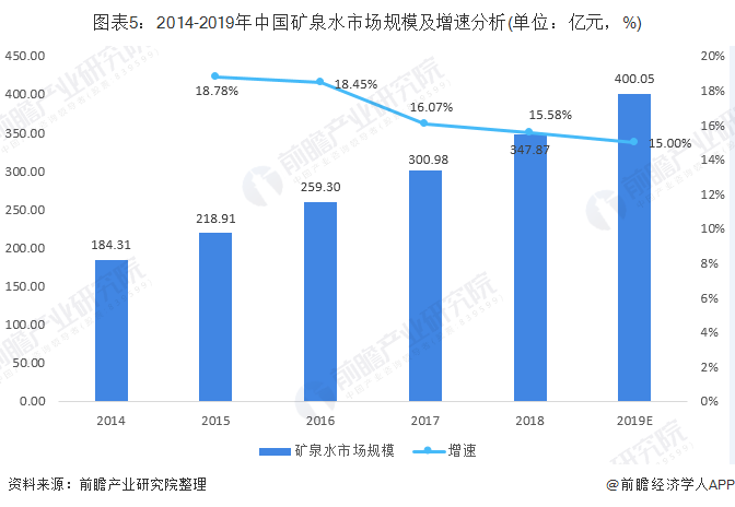 随着矿泉水在市场上被接受的程度逐渐提高,我国矿泉水市场规模逐年增长,2014-2018年行业规模的年均复合增长率达到17.21%。2018年我国矿泉水市场规模达347.87亿元,同比增长15.58%。2019年预计将维持高速增长态势,市场规模将突破400亿元。