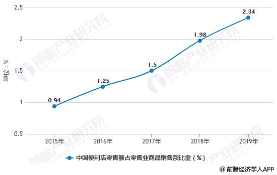 2015-2018年我国便利店零售额占零售业商品销售额比重不断提高。但至2018年,我国便利店销售额占社会零售比重仅为1.98%,占比较低,预计2019年比重将突破2%。因便利店消费场景的核心是便利性,面对快节奏的生活,消费者选择在便利店消费的频次有望增加,便利店的市场规模仍具增长空间。