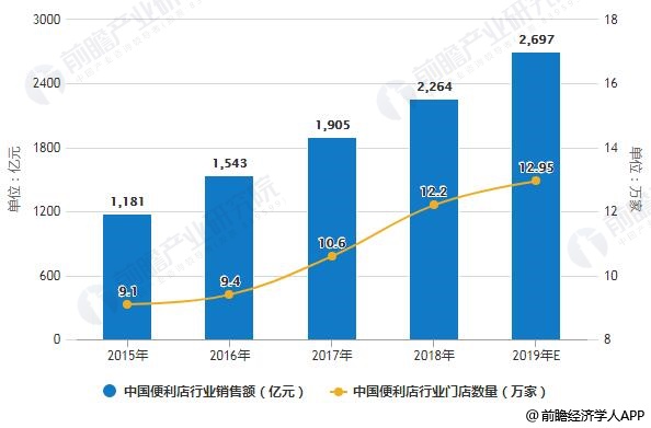 2015-2019年中国便利店行业销售额及门店数量统计情况及预测