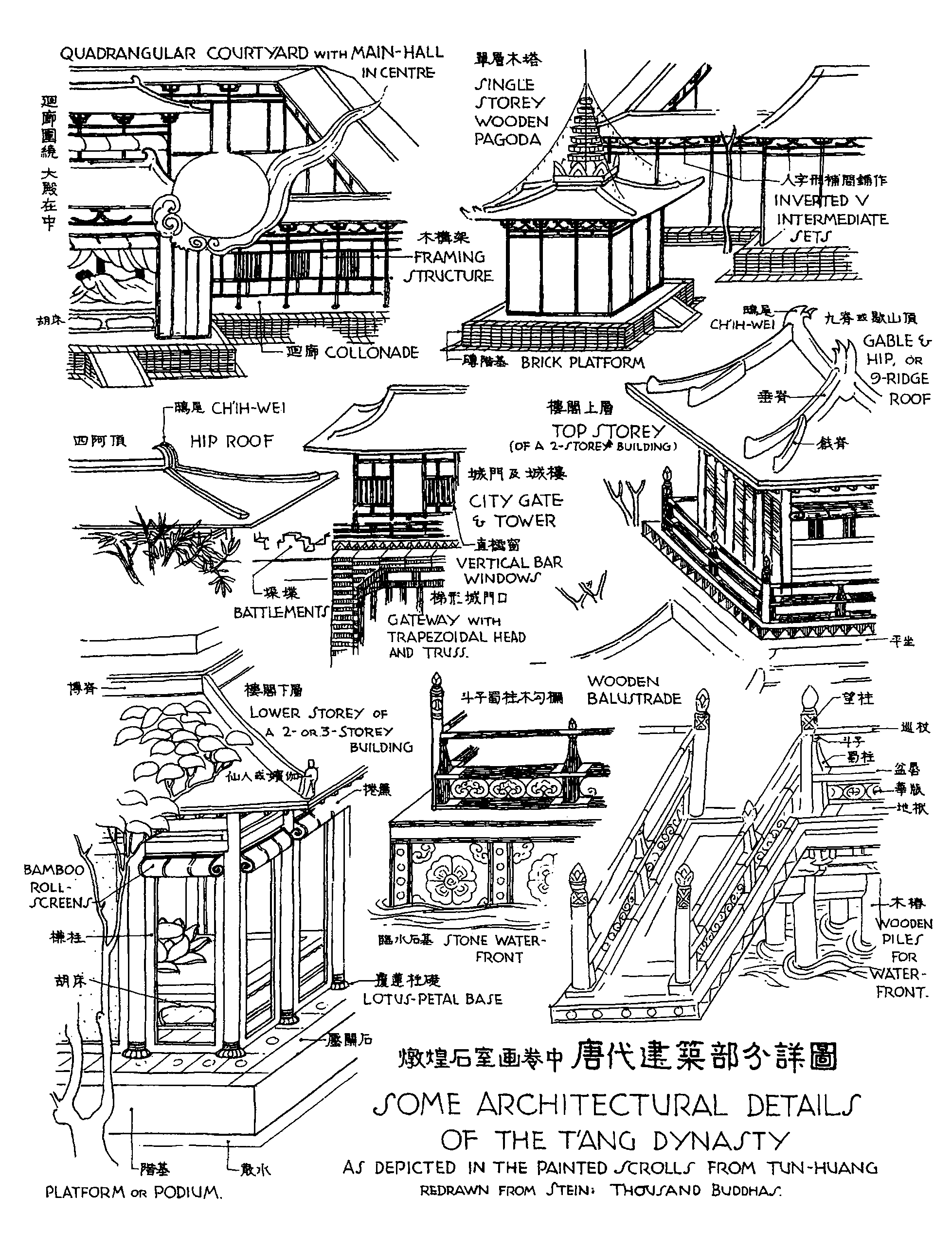 平民居舍,或隐居小屋,则白居易之庐山草堂,可为其例。堂面香炉峰,腋遗爱寺,"三间两柱,二室四牖。洞北户,来阴风,防徂暑也。敞南甍,纳阳日,虞祁寒也。木斫而已不加丹,墙圬而已不加白。磩阶用石,幂窗用纸。竹帘纻帏,率称是焉。堂中设木榻四,素屏二,漆琴一。是居也,前有平地,轮广十丈;中有平台,半乎地;台南有方池,半乎台。环池多山竹野卉,池中生白莲白鱼,又南抵石涧"[20],可略见布置及结构焉。唐代陵墓,多因山为陵。太宗昭陵因九嵕山为之,周以围垣,前建献殿,以功臣密戚陪葬,刻番酋之形,琢六骏之像,以旌武功,立于北阙。规模宏大,为唐代之最。其六骏刻石,尤为著名。高宗乾陵因梁山为之,其石刻番酋六十一人像,并石马,石麒麟等,皆唐代雕刻之重要遗物也[见注2]。