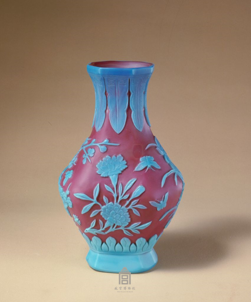 此瓶以豇豆红色玻璃为胎,套饰蓝色花纹。器体为扁八棱状,颈部饰俯蕉叶纹,腹部饰牡丹、荷花、山茶、梅花等,间有蝴蝶、蜜蜂等昆虫在花丛中飞舞,近足处饰花蕾纹一周。底刻阴文楷书“乾隆年制”四字双直线款。