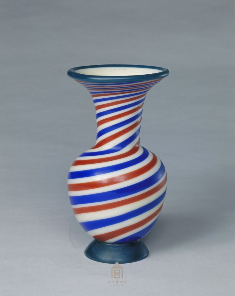 瓶喇叭状圆口,口沿外撇,颈直且较长,约占全器的二分之一弱。腹部类鹅卵形,最大径偏上,近底处束紧,高圈足。足底阴刻楷书“乾隆年制”四字款分布周边的上、下、右、左处。瓶的口沿和足部为碧绿色,颈、腹部饰白、蓝、红三色相间的条带纹,斜向缠绕全器,其颜色的相间规律为白、红、白、蓝。