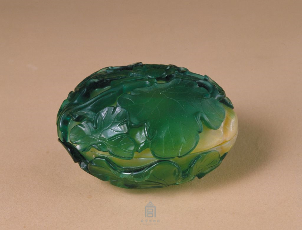 此盒的形状如一绿叶下覆盖的甜瓜,匠艺独到。玻璃质地晶莹透亮,光泽度好,有宝石的效果。
