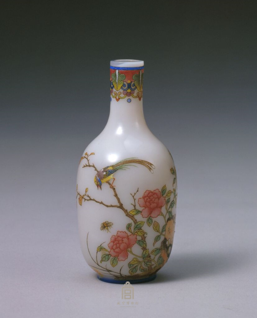 玻璃胎画珐琅是清代与铜胎、瓷胎画珐琅先后出现的新工艺,而唯玻璃胎画珐琅制作难度大,传世品少。此件小瓶造型秀美,胎色洁白,温润如玉,表面有一层光亮的凝脂,所绘花鸟图传神而柔美,赏心悦目。此玻璃胎画珐琅瓶是清宫造办处玻璃厂和珐琅厂联合制做的精品。