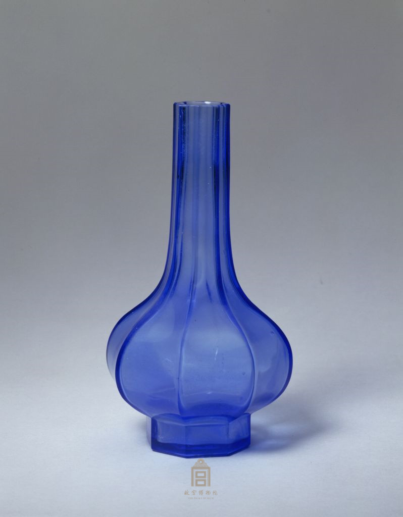 从目前的传世品看,玻璃八棱瓶的造型始见于雍正朝,乾隆时期曾以不同色泽的玻璃进行仿制,产品如出一辙,若无款识,则难以分辨。嘉庆以后仍有制作,但造型不规范,质不纯,色不佳,无法与雍、乾制品相提并论。该瓶造型规整,棱角笔直清晰,色泽雅致,晶莹剔透,虽无纹饰,却以其精巧的造型、宝石般的色泽和纯净无暇的质地取胜,格调高雅,显示了清宫玻璃厂高超的技艺,表明清雍正、乾隆二朝的玻璃制作工艺已达到其巅峰。