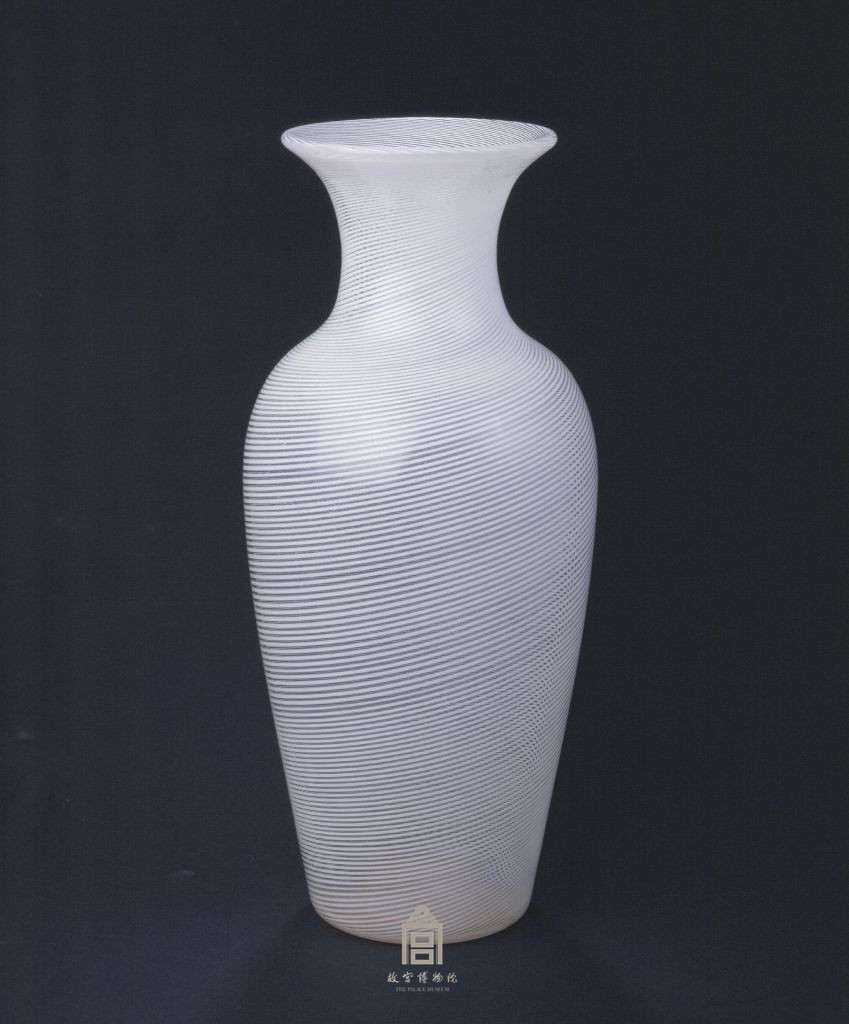 瓶圆形,长身,喇叭口,细颈,丰肩,平底。通体以无色透明玻璃和白色不透明玻璃相间,作均匀的条带状,呈螺旋上升之势。