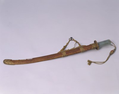 此刀护手为铁鋄金镂空如意圆盘,内有四条可活动的奔龙,青玉柄,木质蒙金桃皮鞘。腰刀属于冷兵器,其设计独特,造型庄重,纹饰美观,制作精细,不仅继承了我国古代刀、剑的传统式样和做法,而且也反映了清代内务府造办处制作冷兵器最高技术水平。
