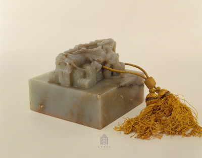 青玉质,交龙纽方形玺,满汉文篆书。附系黄色绶带。