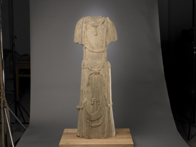 菩萨袒裸上身,佩戴项饰,身挂X形长缨络。肩挎帔帛在腹、膝部缠绕呈弧形。裙腰外翻,腰间垂挂帛带。河北曲阳修德寺遗址出土。
