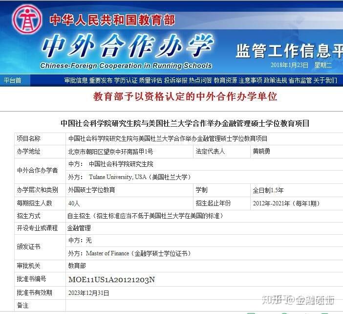 [size=0.8]2012年经教育部批准办学,中国社会科学院研究生院与美国杜兰大学(Tulane University)合作举办“金融管理硕士”项目,入学免全国统考,毕业所获得双证与一月份联考双证具有同等效力。一年半学制,周末在职上课,很适合职场工作人士来读。毕竟能节省大量备考的时间精力,也不耽误工作,最重要可以获得国际顶尖商学院全日制学位证书,跟去美国杜兰大学留学获得的学位证书可是一模一样的,而且可以在教育部留学服务中心做学历学位认证呦!