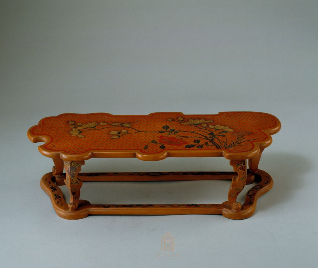 几面为曲边随意形,拱肩三弯式象鼻腿,腿下连接与几面随形的落地托泥。通体以赭黄色漆为地,戗金彩漆为纹。几面红漆弦纹随形开光,开光内“卐”字锦纹地上,以红、白、绿、黑四色漆描饰玉兰、月季和蜻蜓,以细划沟戗金勾出花纹轮廓及脉络。四腿饰葡萄、佛手、桃实等。托泥饰杂宝纹。几底面中央镌刻填金楷书“大清康熙年制”横行六字款。
