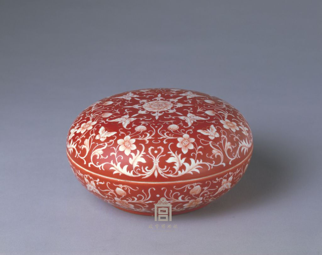 盒呈扁圆形,上下子母口套合,圈足。盒内施白釉,外通体矾红彩为地留白蝴蝶纹及缠枝花纹装饰。外底青花双圈内署青花“大清雍正年制”双行六字楷书款。